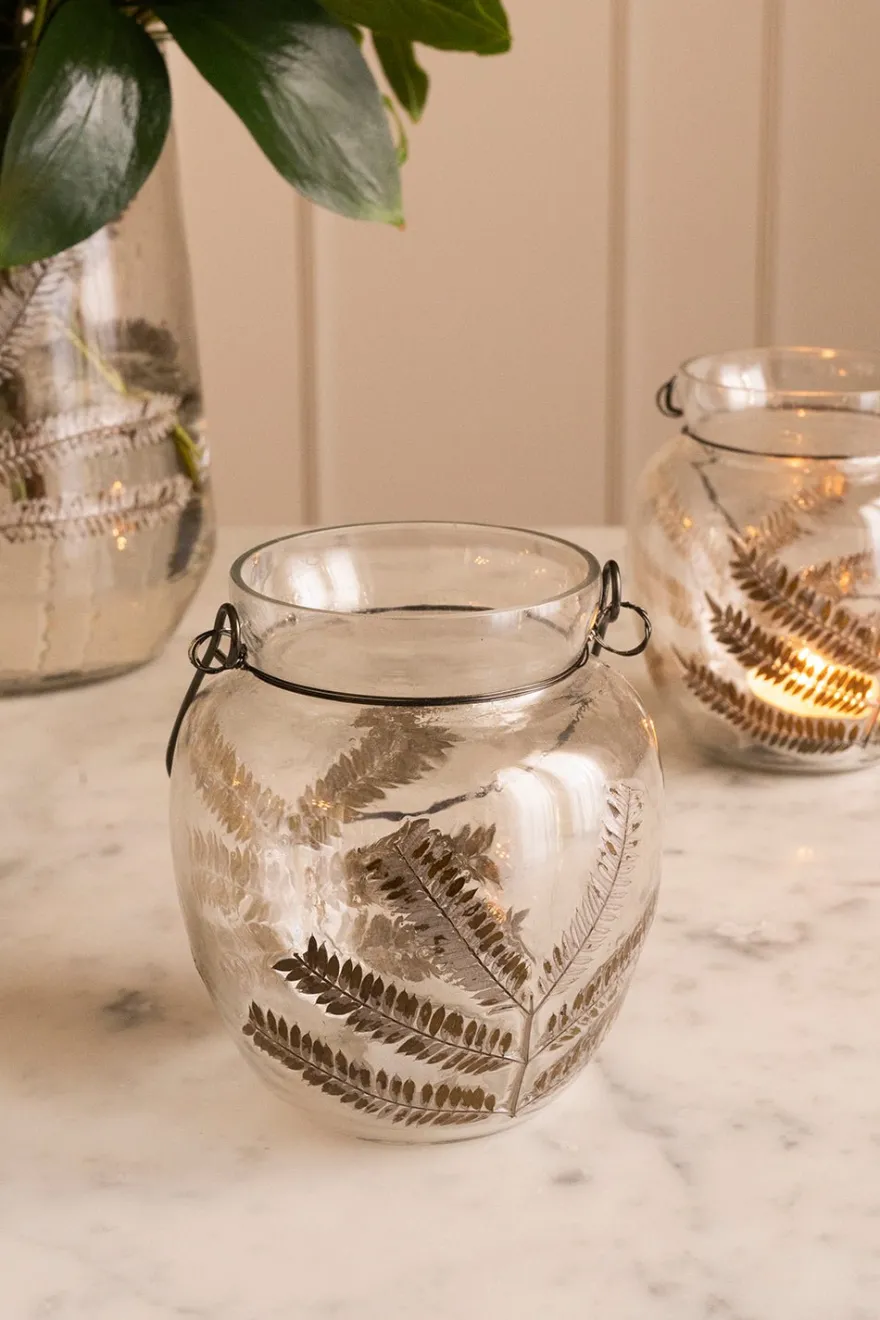 Portavelas de cristal con diseño de hojas marrones oscuras con asa, ideal para complementar las mesas en otoño, o para decorar cualquier rincón de tu casa.
