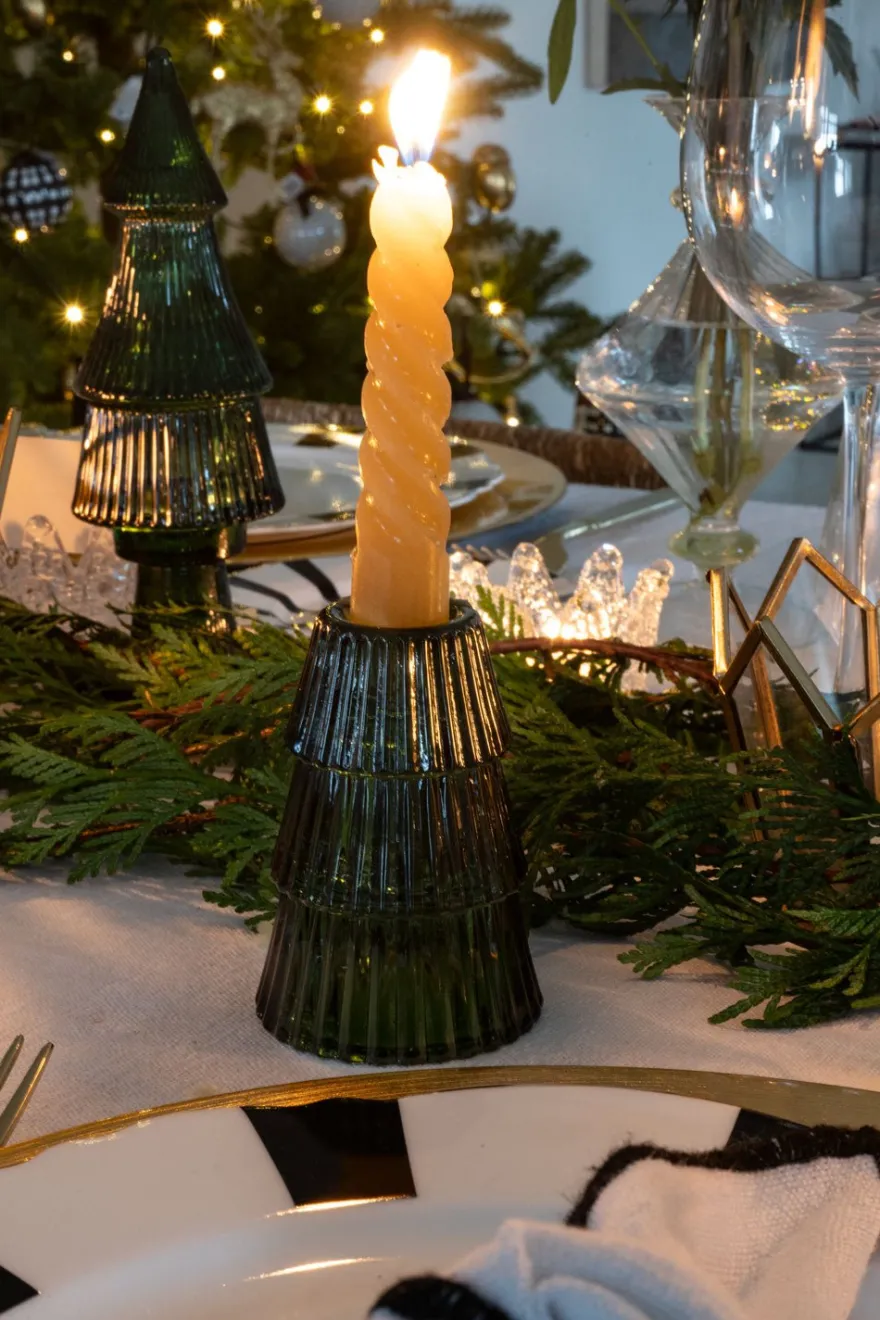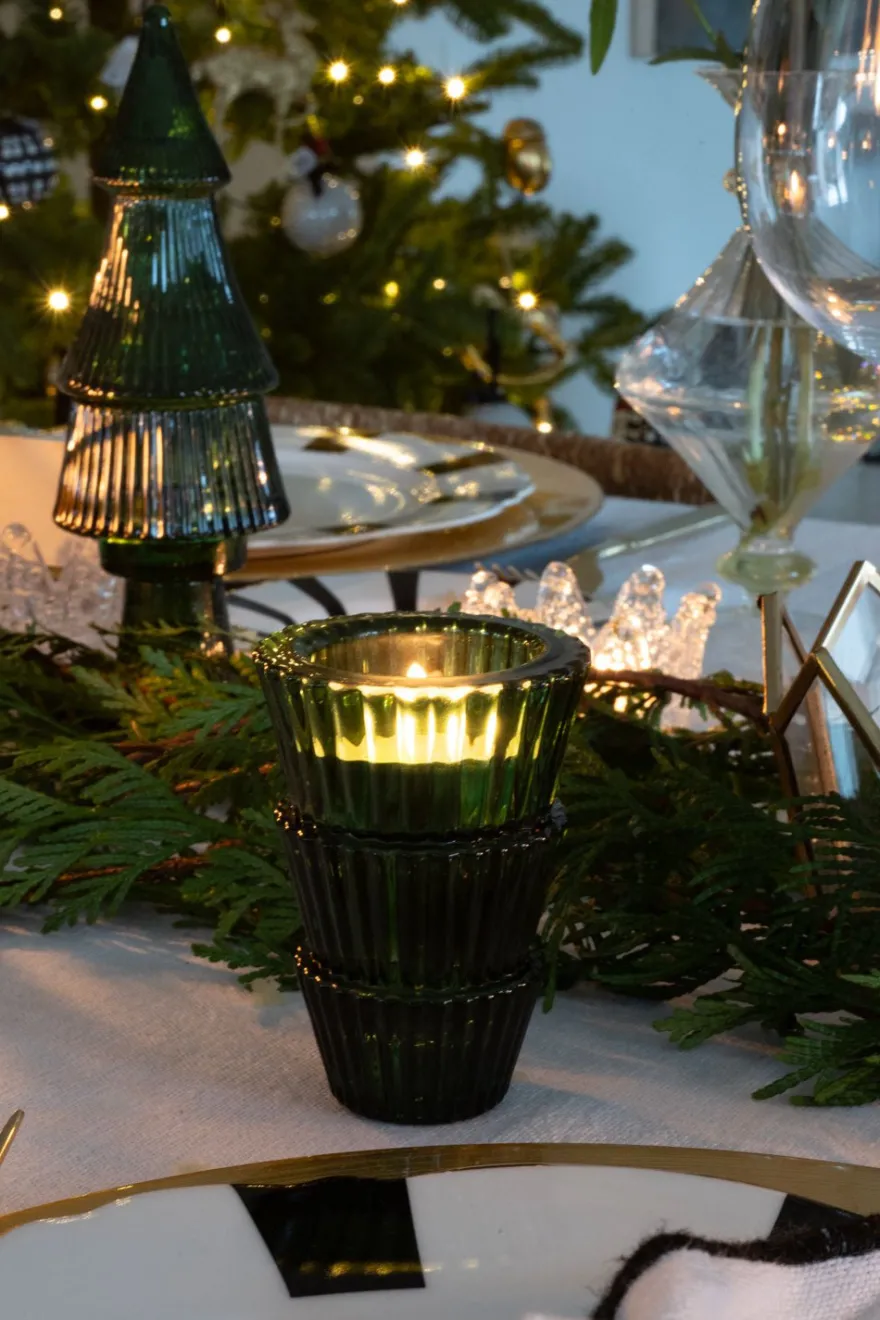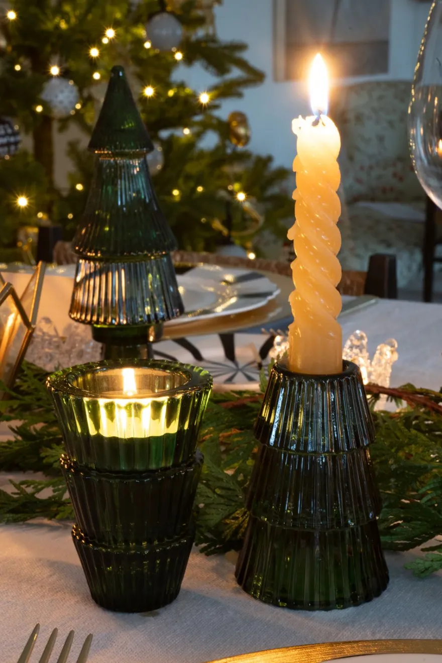 Portavelas de cristal con diseño de abeto, ideal para ambientar y decorar cualquier rincón de tu casa durante las Navidades o en cualquier época del año.