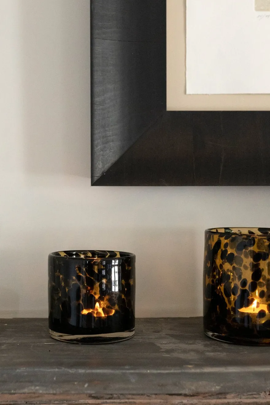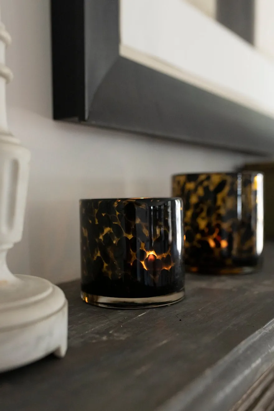 Portavelas de vidrio con diseño de manchas negras sobre fondo de color ámbar, original para decorar cualquier rincón de tu casa.