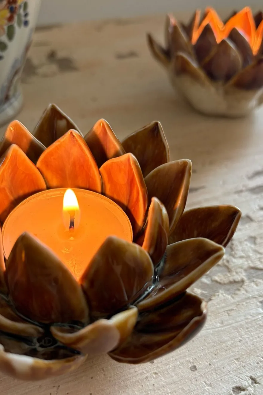 Elegante portavelas de loza fina esmaltada, con un delicado diseño de flor de loto en un suave tono marrón. Su diseño atemporal y su combinación de colores lo convierten en una pieza versátil que complementará cualquier estilo de decoración.