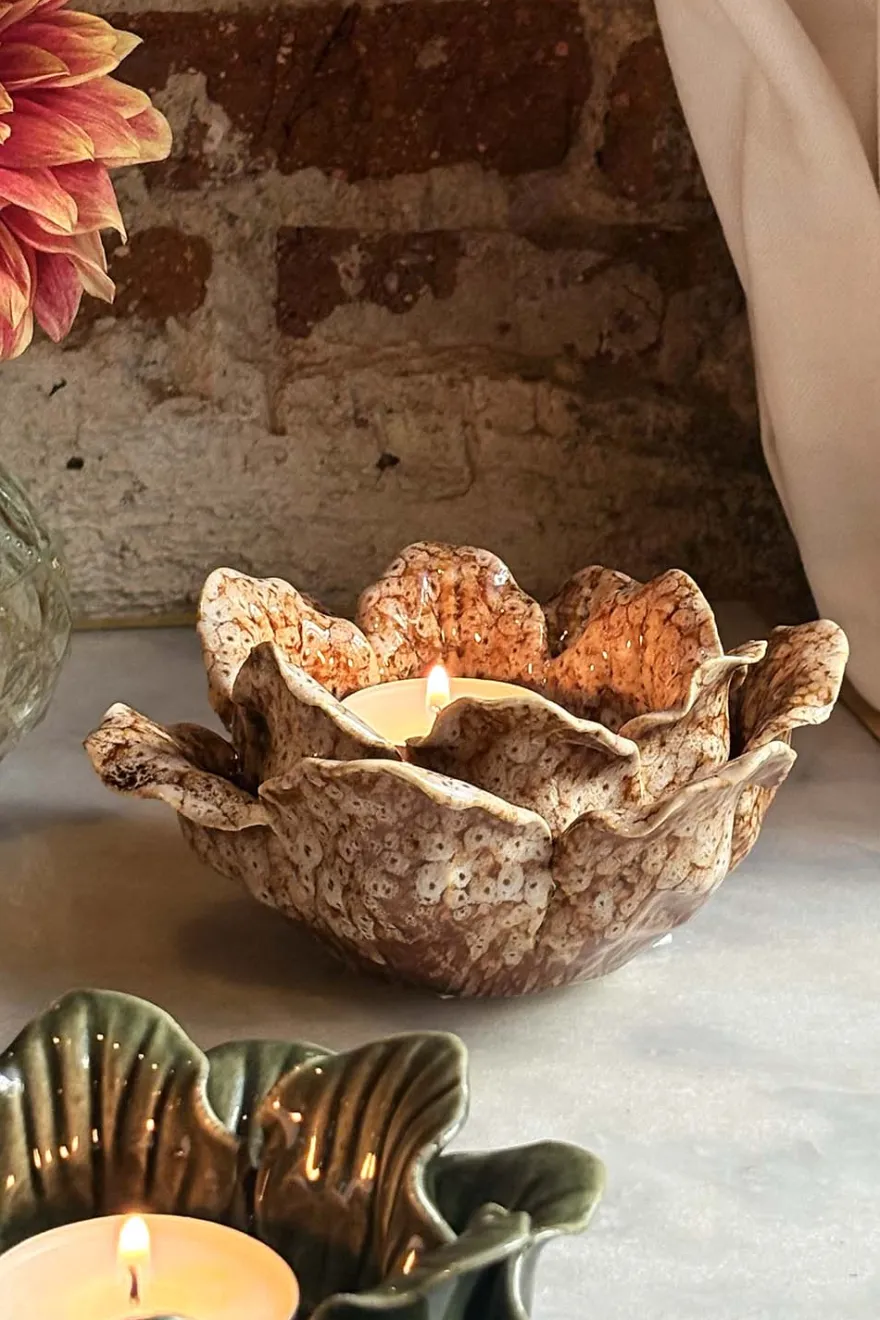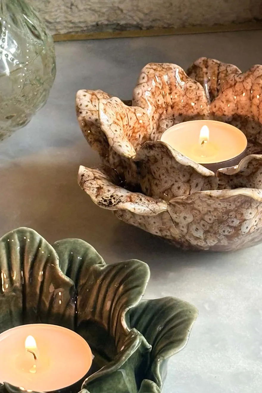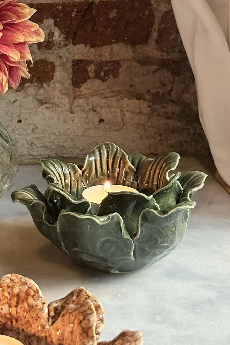 Elegante portavelas de loza fina esmaltada, con un delicado diseño de flor. Su diseño artesanal y atemporal lo convierten en una pieza versátil que complementará cualquier estilo de decoración.