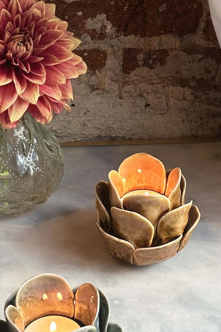 Elegante portavelas de loza fina esmaltada, con un delicado diseño de flor. Su diseño artesanal y atemporal lo convierten en una pieza versátil que complementará cualquier estilo de decoración.