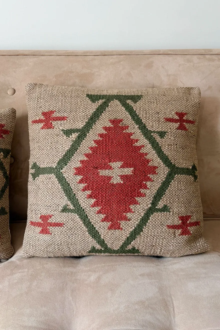 Colección de cojines elaborados en yute y lana, materiales naturales que aportan textura, calidez y un carácter artesanal a cualquier espacio. Sus diseños geométricos, inspirados en tejidos tradicionales tipo kilim, combinan tonos tierra y motivos étnicos que encajan fácilmente en ambientes boho, rústicos o contemporáneos.