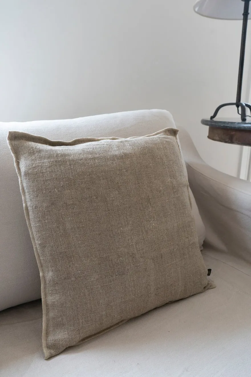 Cojín de lino hecho a mano, en color beige con borde del mismo color en una tonalidad más clara, que le dará un aspecto fresco, elegante y lujoso a tu salón o dormitorio.