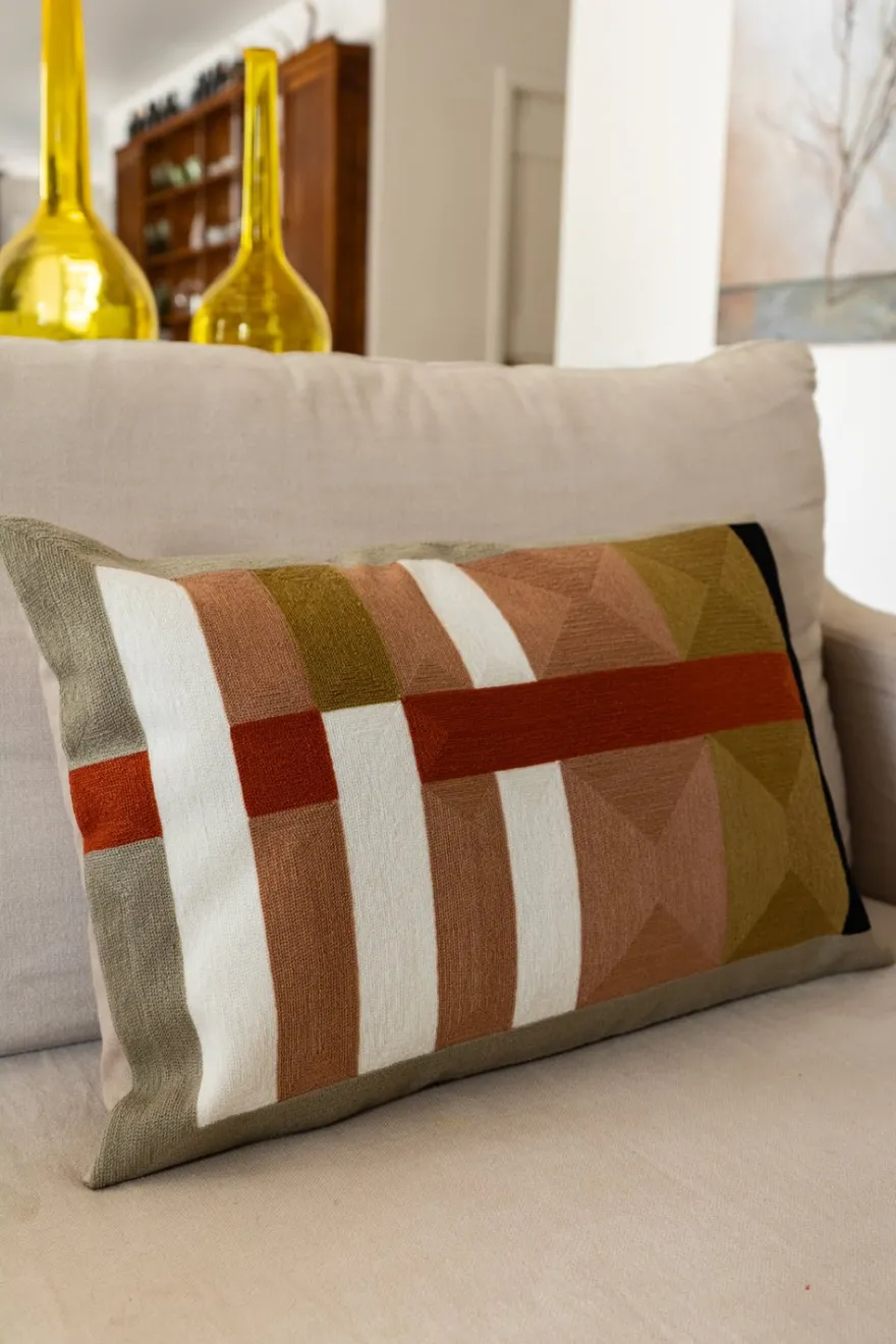 Cojín de 100% algodón, con diseño geométrico en tonalidades tierra, que le dará un aspecto fresco, elegante y lujoso a tu salón o dormitorio.