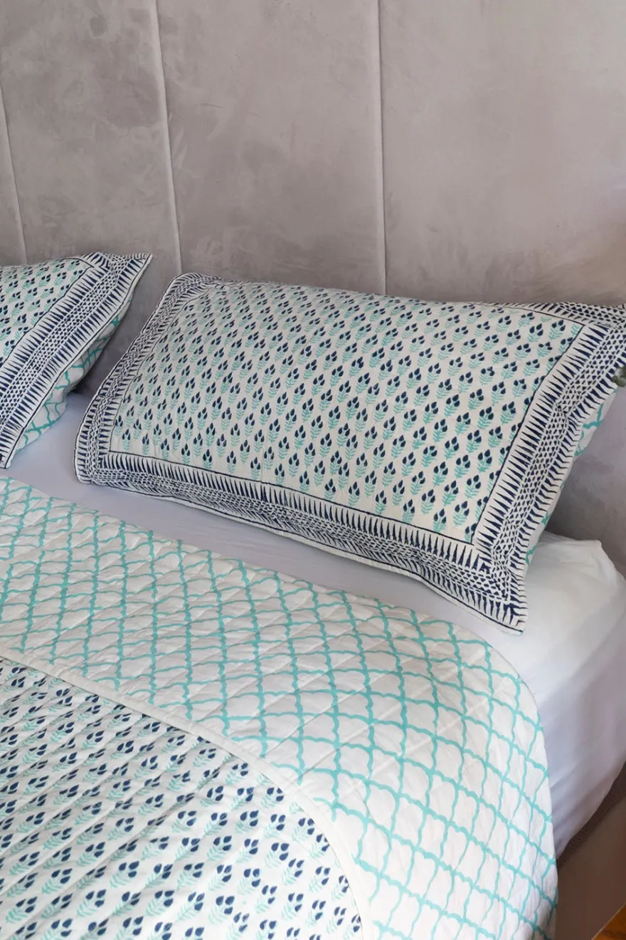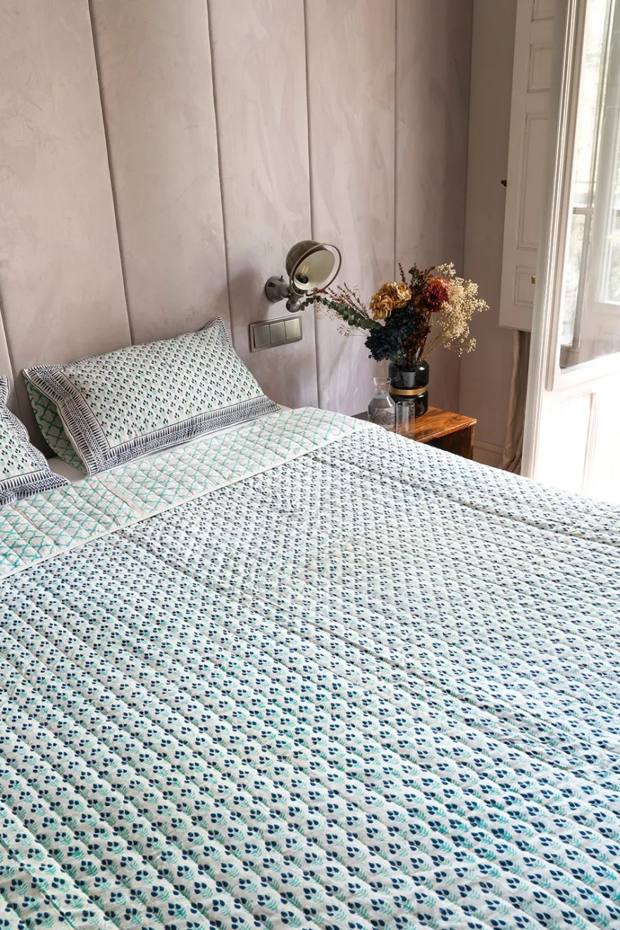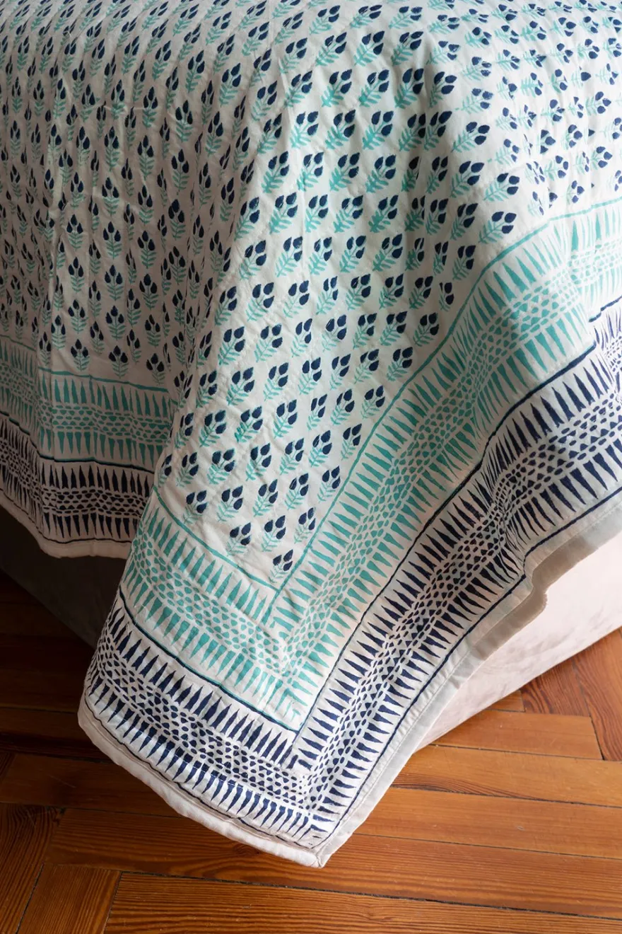 Edredón 100% algodón con diseño Mira, cuyo significado es “Océano», pintado a mano en la India.