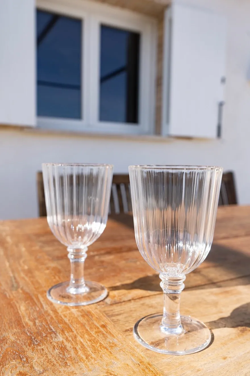 Set de dos copas de vino transparentes de acrílico con efecto de cristal en relieve.