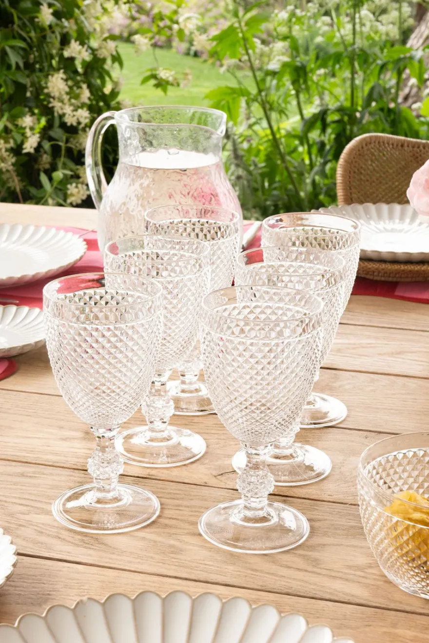 Set de seis copas de vino de nuestra cristalería acrílica con diseño de picos transparentes que combina el aspecto del vidrio con la durabilidad del acrílico.