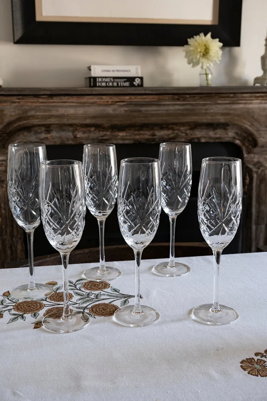 Set de seis copas de champagne de cristal talladas con diseño de racimo de espigas, de vidrio sodocálcico muy resistentes.