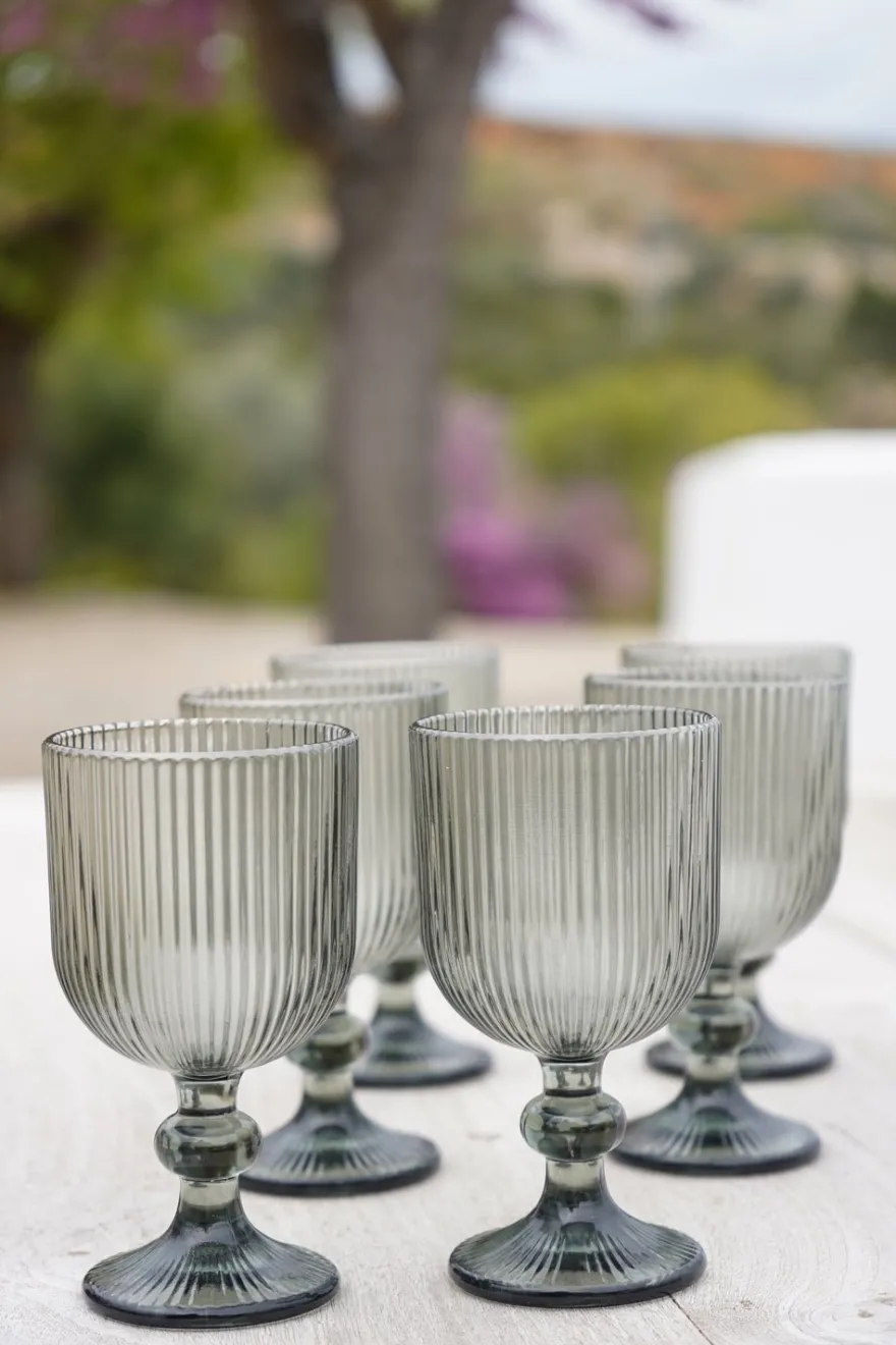 Set de seis copas de cristal de diseño en color grises, ideales y versátiles para complementar todo tipo de mesas en cualquier época del año.