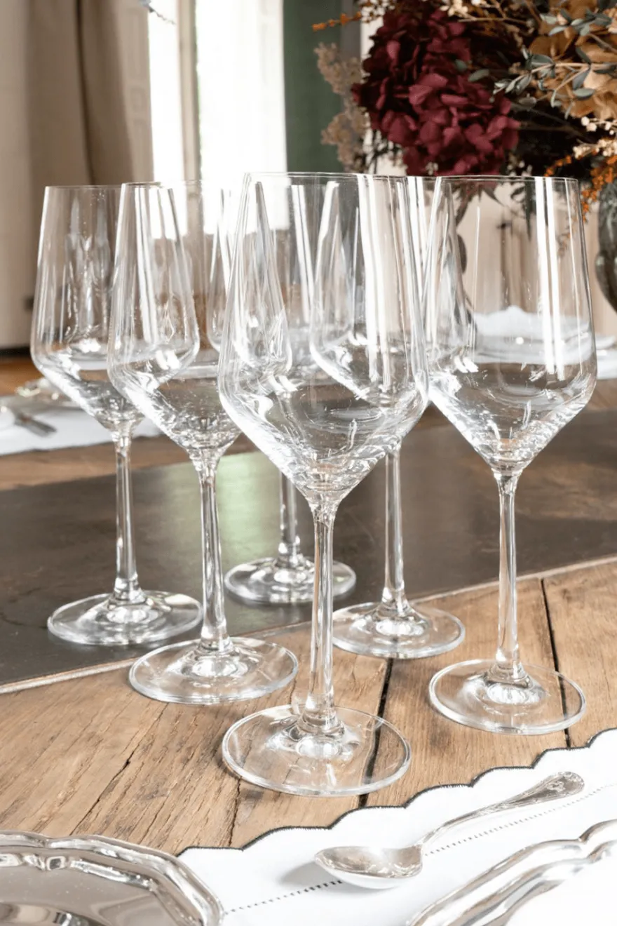 Set de seis copas de cristal especiales para vino, alargadas y finas, ya que sus bordes están cortados con láser fino, y perfectas para que el vino se pueda airear y por tanto degustar.
