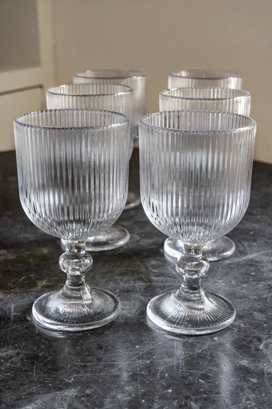 Set de seis copas de cristal transparente con diseño tallado, que aportan sofisticación y estilo a cualquier mesa. Su delicado grabado y la claridad del cristal hacen de estas piezas una opción ideal tanto para ocasiones especiales como para el uso diario.