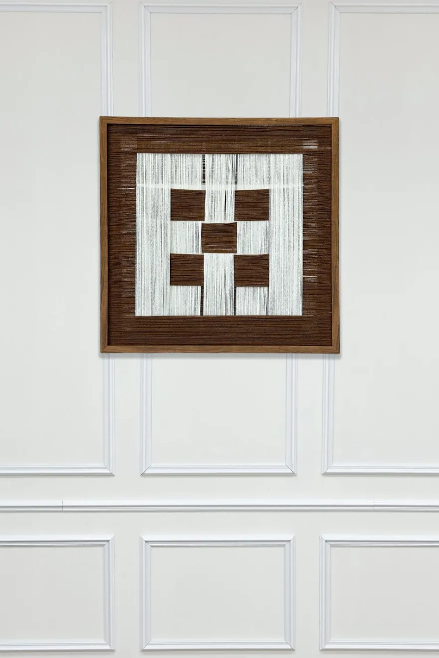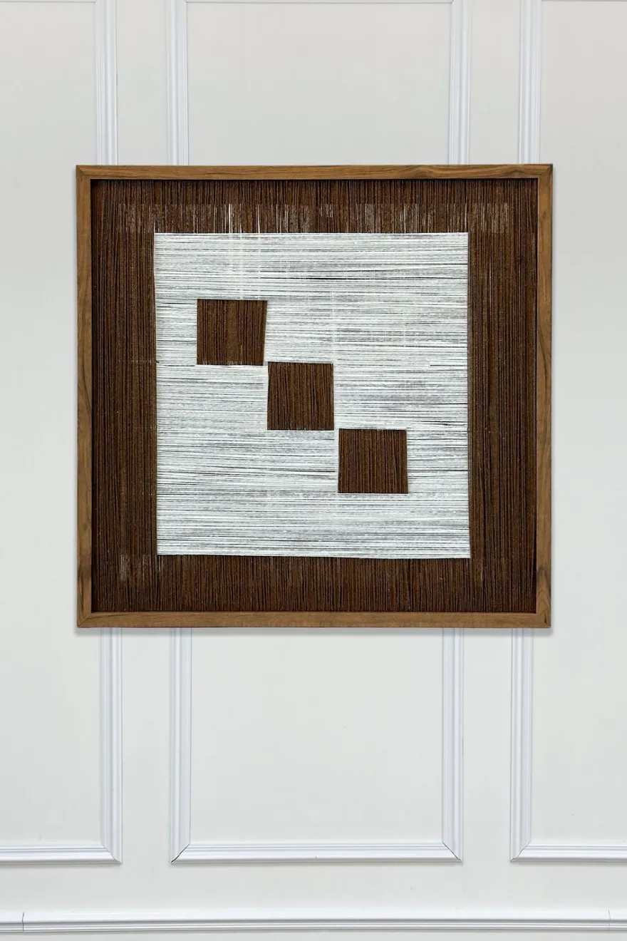 En el centro, los cuadrados en tono marrón destacan sobre el fondo de hilos blancos, creando un contraste moderno y equilibrado. El marco de madera aporta calidez y realza la composición artesanal del diseño.