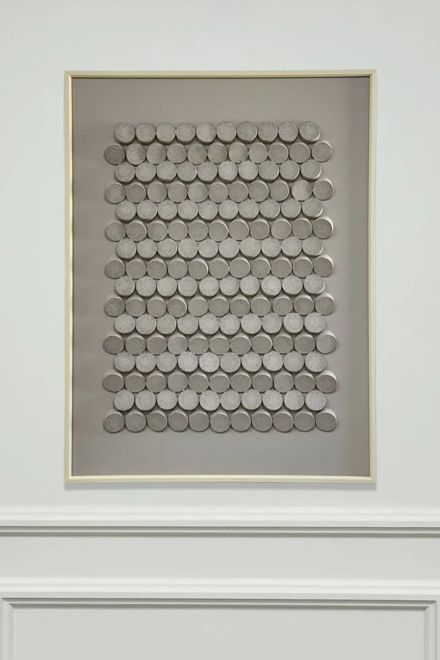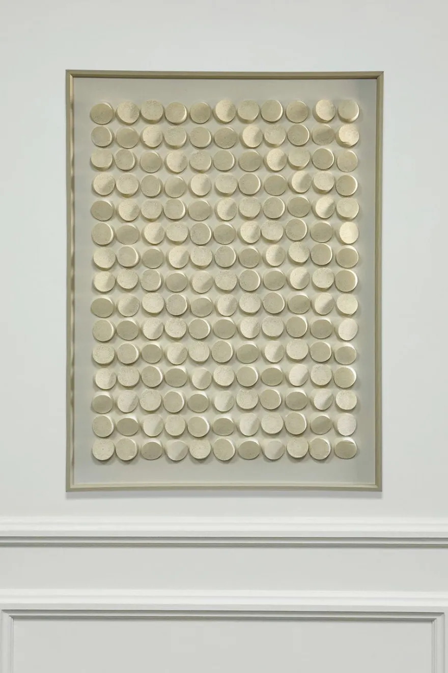 Este cuadro presenta muchos círculos del mismo tamaño organizados en filas y columnas. Disponible en un tono claro o grisáceo, y tienen un ligero relieve que hace que la luz y las sombras se noten sobre su superficie. La obra tiene un estilo simple y ordenado, con un efecto visual armonioso y tranquilo.