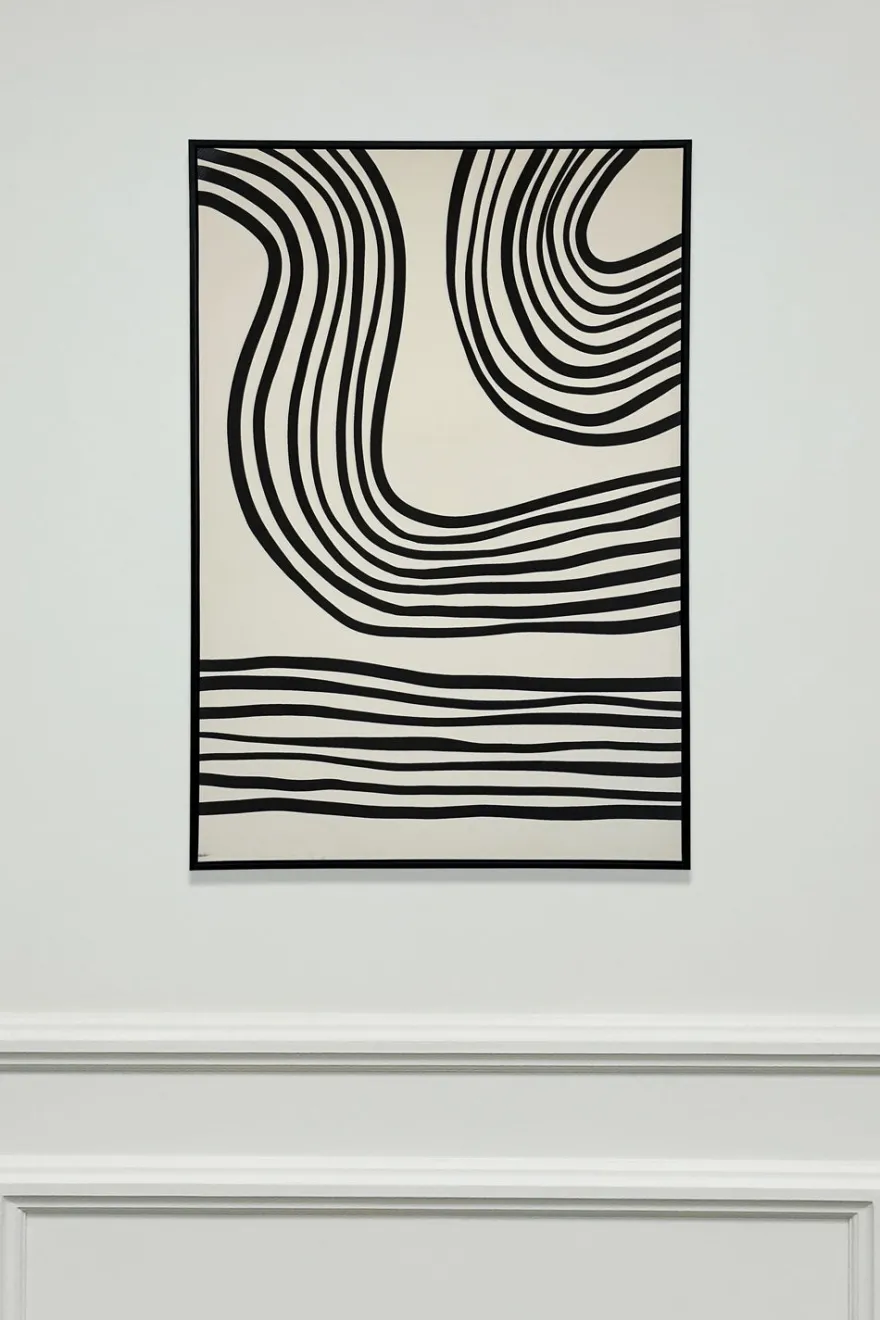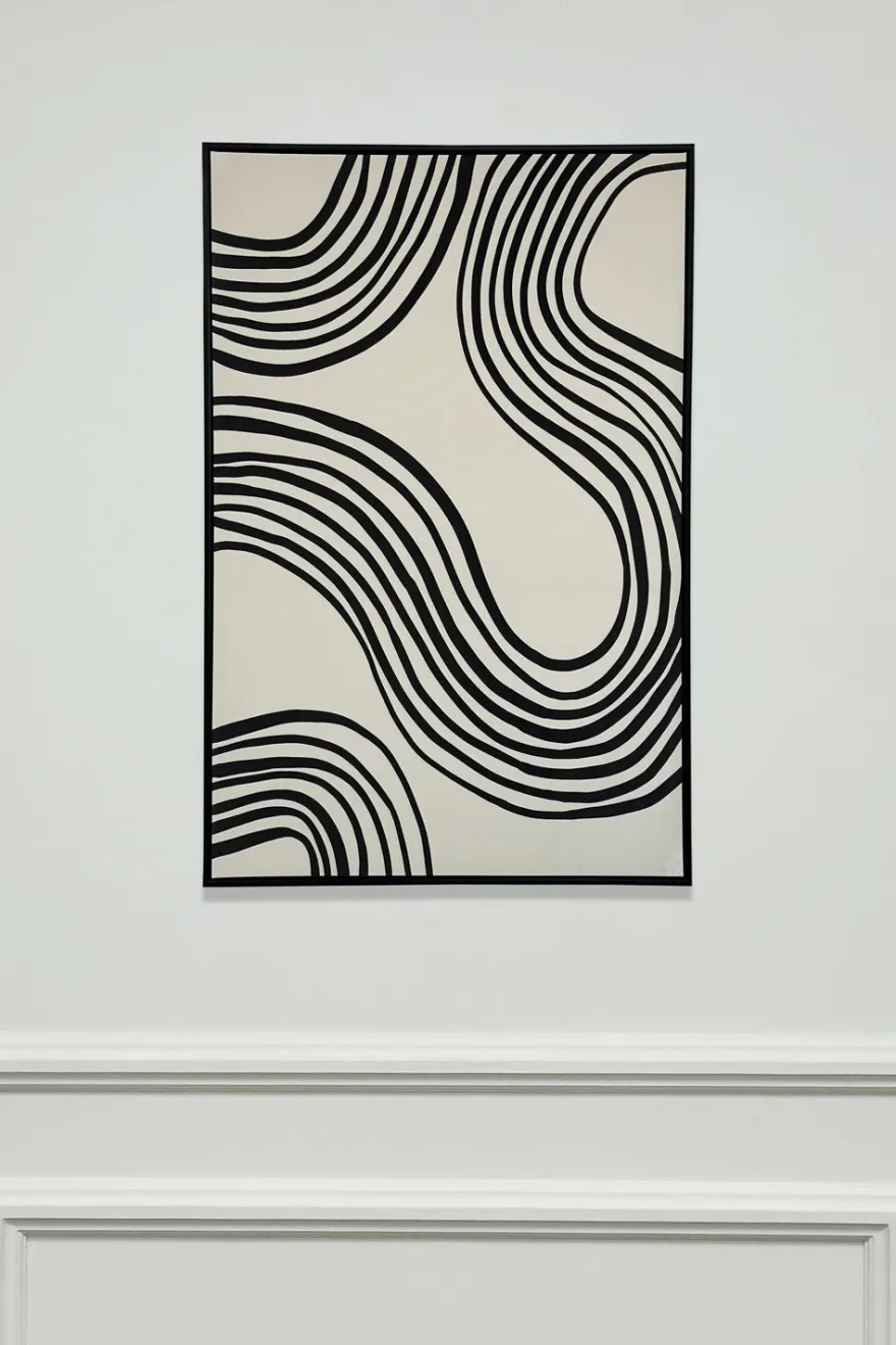Lienzo pintado con líneas onduladas en relieve de color negro sobre fondo claro. El diseño combina curvas suaves y formas continuas que transmiten movimiento y armonía. Su estilo minimalista aporta un toque moderno y elegante a cualquier espacio.