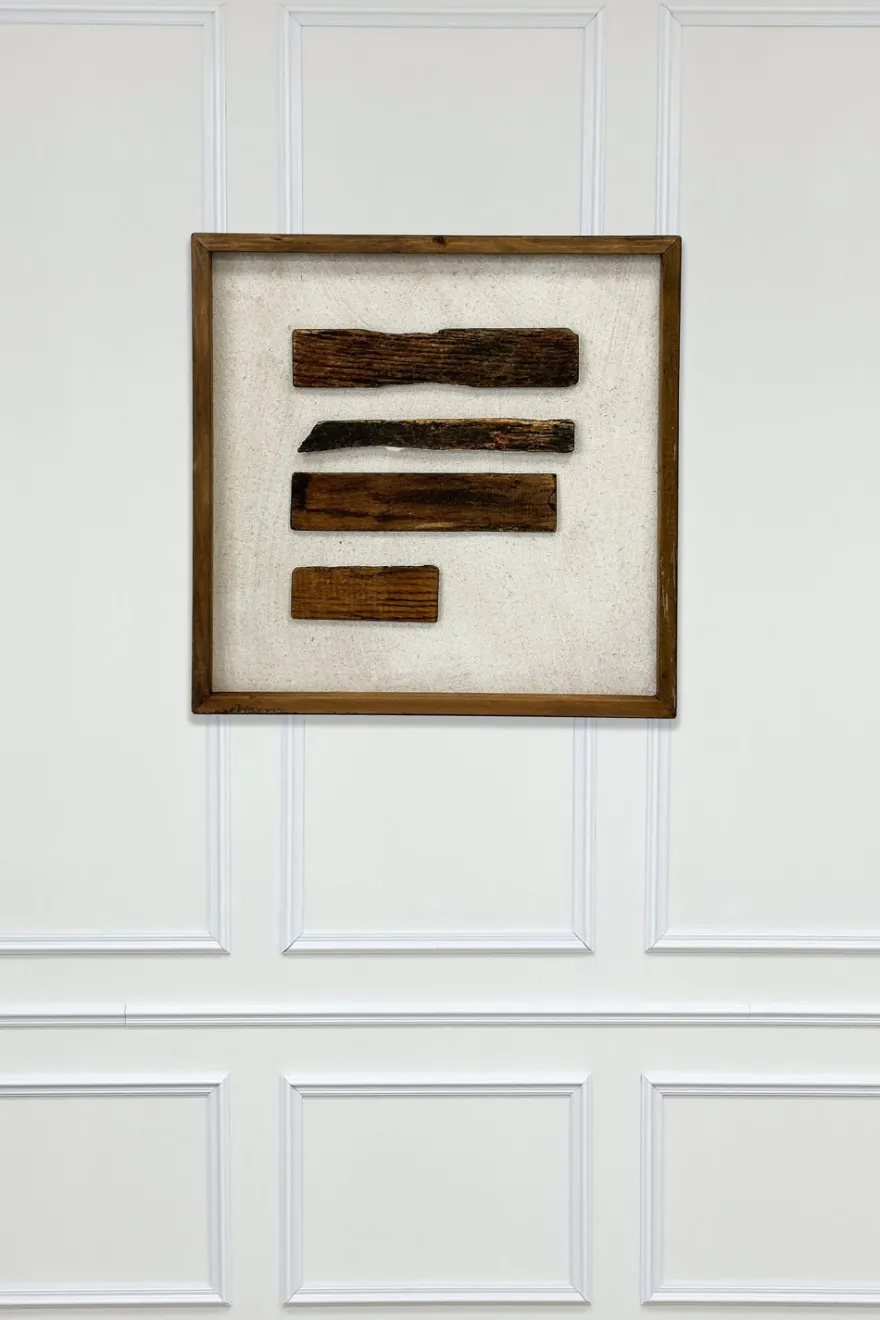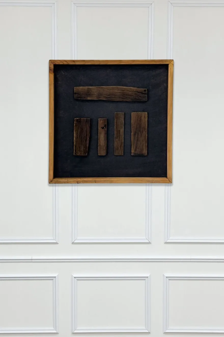 Cuadro decorativo de estilo abstracto compuesto por piezas de madera natural dispuestas de forma horizontal sobre un fondo texturizado. Cada fragmento de madera conserva su forma y veta original, creando una composición orgánica que aporta carácter, calidez y profundidad al espacio.
