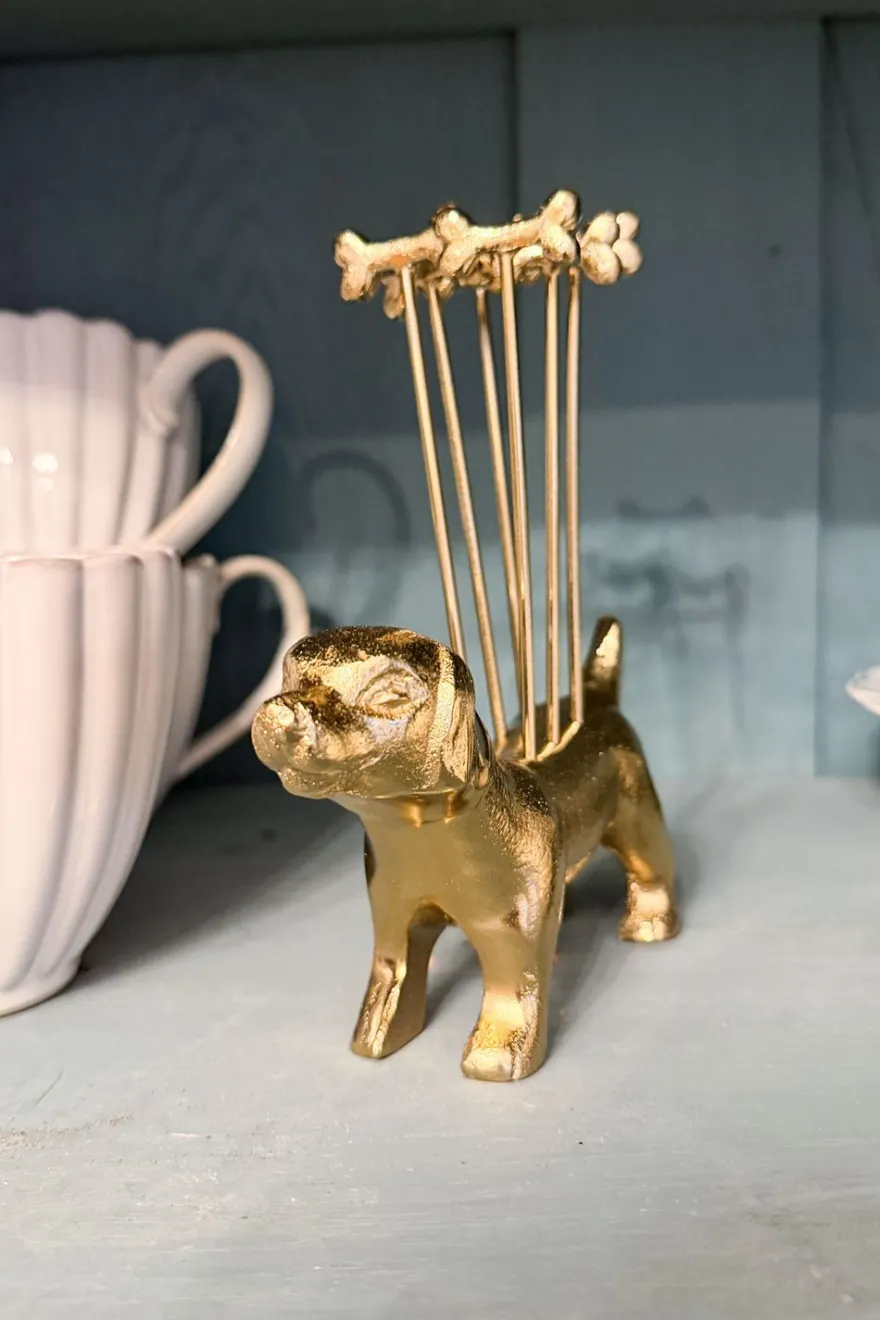 Elegante adorno en forma de perro con acabado de bronce, que incluye seis pequeños tenedores ideales para servir aperitivos con estilo. Su diseño decorativo y funcional aporta un toque sofisticado a la mesa, convirtiéndolo en un complemento perfecto para reuniones, celebraciones o cualquier ocasión especial.