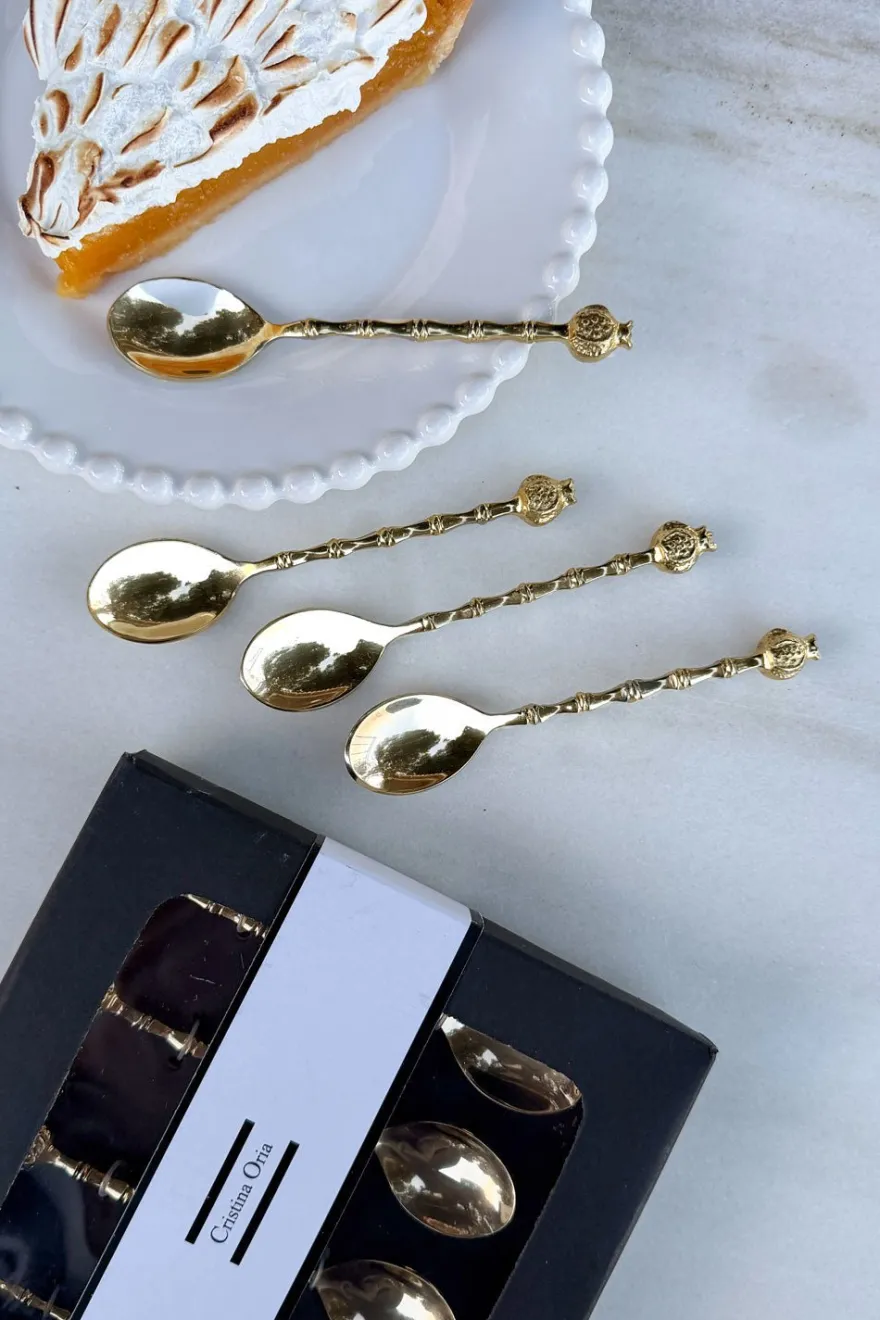 Este elegante set de cuatro cucharitas de bronce es el complemento perfecto para cualquier mesa. Cuentan con la figura de una delicada granada en su extremo, lo que las convierte en un regalo único.