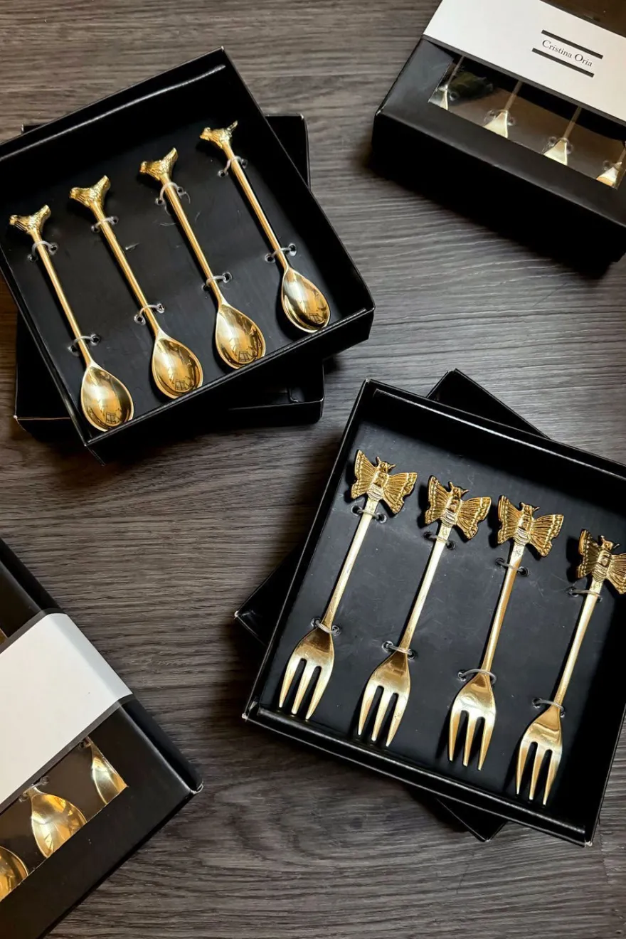 Este elegante set de cuatro tenedores de bronce es el complemento perfecto para cualquier mesa. Cuentan con la figura de una delicada mariposa en su extremo, lo que los convierte en un regalo único.