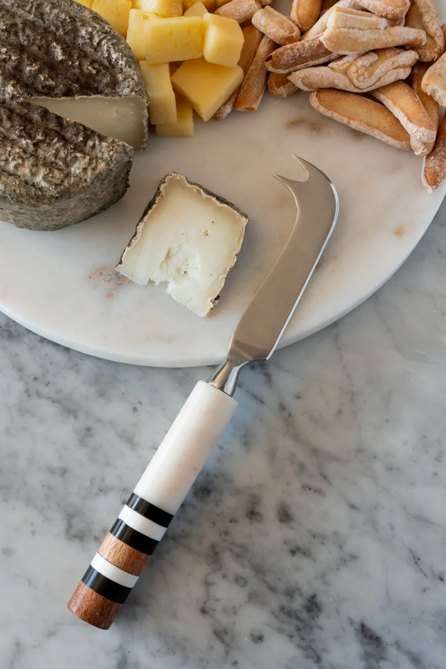 Cuchillo especial para quesos con mango de mármol y detalles de madera, que combina elegancia, sofisticación y durabilidad.