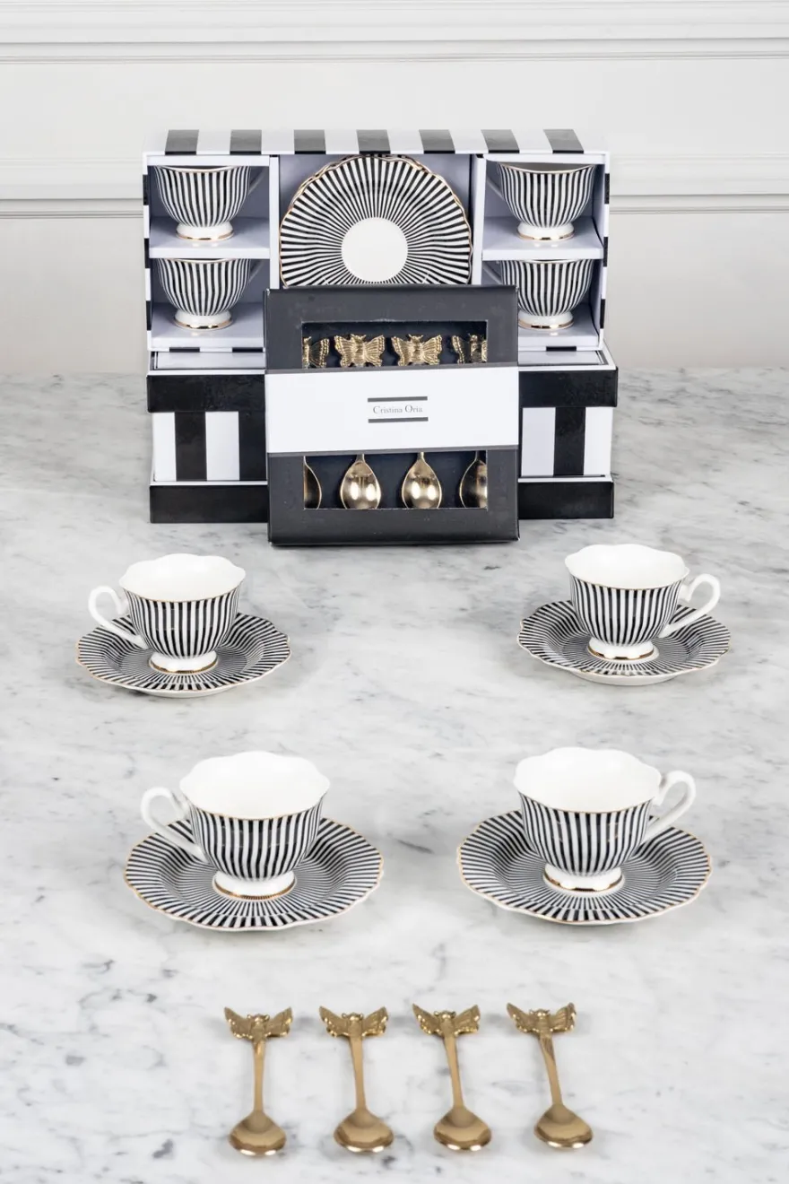 – Juego de cuatro tazas espresso y platos de nuestra icónica vajilla blanca y negra. Vienen en una caja con el mismo diseño, ideal para regalar