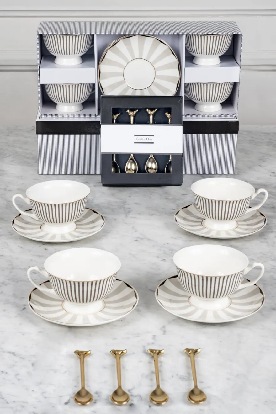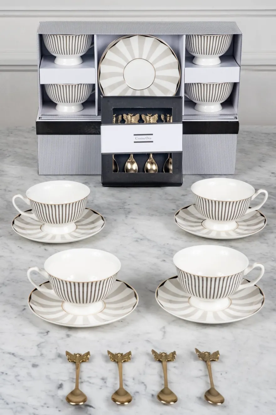 – Juego de cuatro tazas y platos de nuestra icónica vajilla blanca y gris. Vienen en una caja con el mismo diseño, ideal para regalar