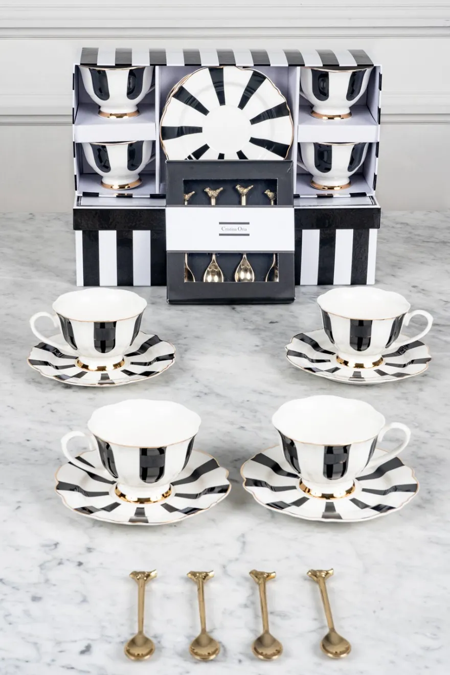 – Juego de cuatro tazas y platos de nuestra icónica vajilla blanca y negra. Vienen en una caja con el mismo diseño, ideal para regalar