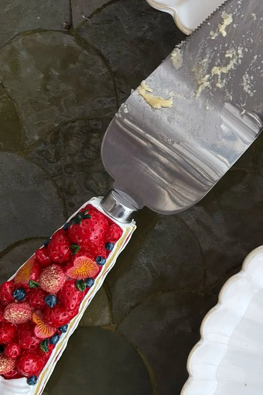 Original pala especial para servir y cortar tartas o postres con un diseño único de tarta de bizcocho con frutos rojos. No solo es funcional, sino que también añade un toque alegre y colorido a cualquier mesa.