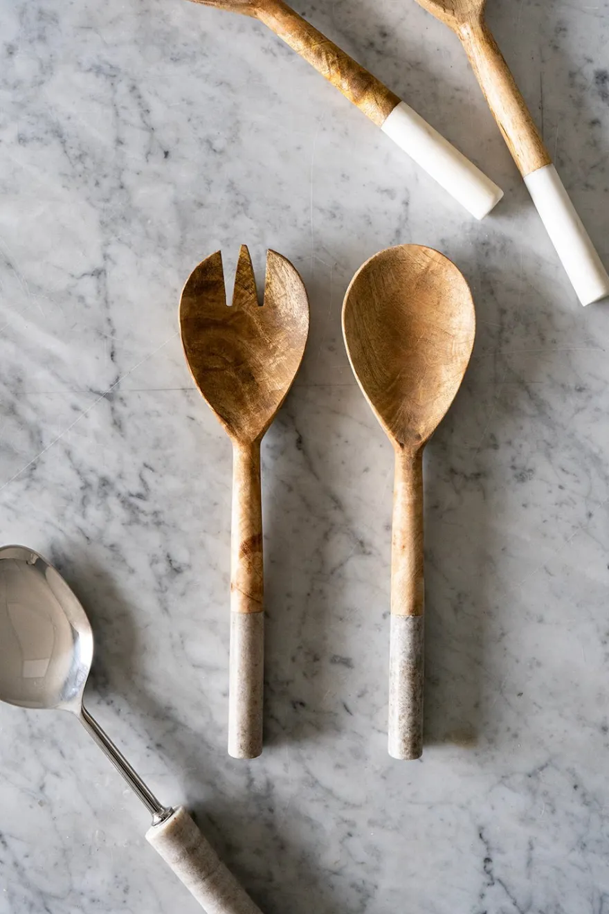 Cubiertos de servir de madera con mangos de mármol en color gris claro, perfectos para complementar tu mesa tanto en ocasiones especiales como durante el día a día.
