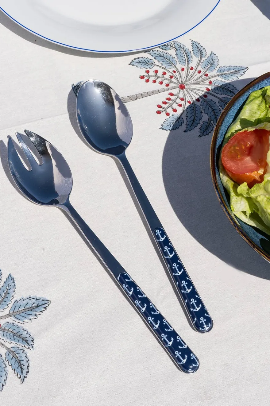 Set de dos cubiertos de servir fabricados en Italia con diseño de anclas sobre fondo azul, perfectos para complementar tus mesas de verano.