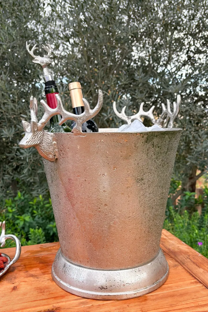 Cubitera de aluminio con detalles decorativos de cabezas de ciervo en relieve. Su acabado plateado le da un aspecto elegante y distintivo, ideal para mantener frías botellas de vino o champagne con estilo. Perfecta para ocasiones especiales o como pieza decorativa en reuniones y celebraciones.