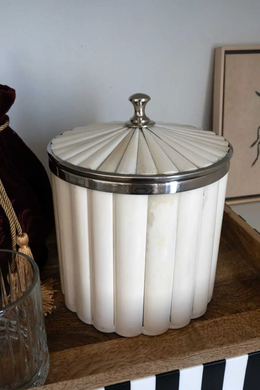 Cubitera de asta con diseño blanca. Todas nuestras cubiteras están elaboradas con patrones únicos, completamente fabricadas de manera artesanal. Son diseñadas y pulidas de tal forma que su acabado permanece como el primer día durante mucho tiempo.
