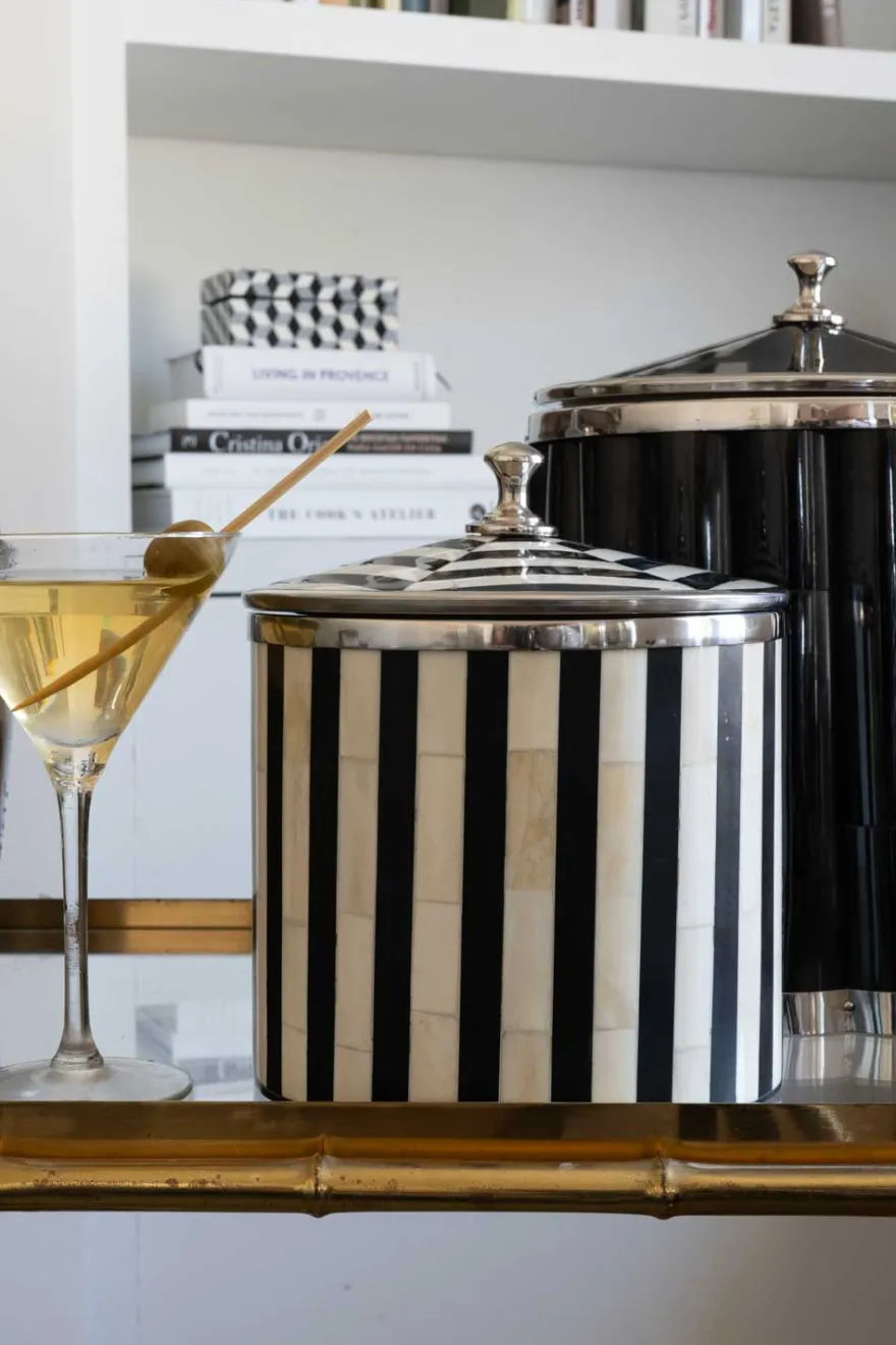 Cubitera de hueso con diseño de rayas blancas y negras. Todas nuestras cubiteras están elaboradas con patrones únicos, completamente fabricadas de manera artesanal. Son diseñadas y pulidas de tal forma que su acabado permanece como el primer día durante mucho tiempo.