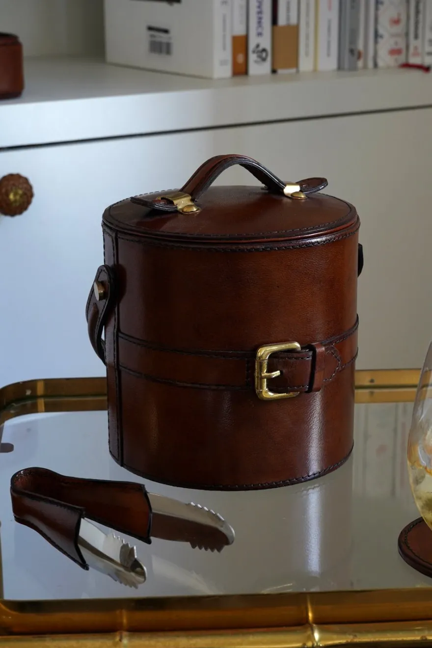 Esta cubitera de cuero es un accesorio elegante y funcional, que al estar revestida de cuero, le da un aspecto sofisticado y lujoso, ideal para complementar la decoración de una mesa o barra.
