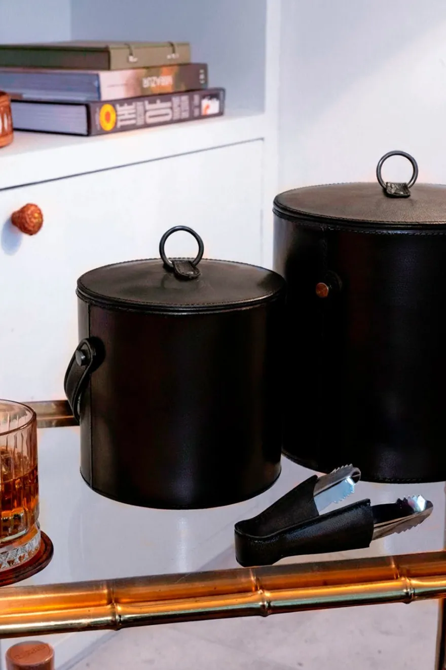 Esta cubitera de cuero con tapa es un accesorio elegante y funcional que al estar revestida de cuero negro, le da un aspecto sofisticado y lujoso, ideal para complementar la decoración de una mesa o barra.