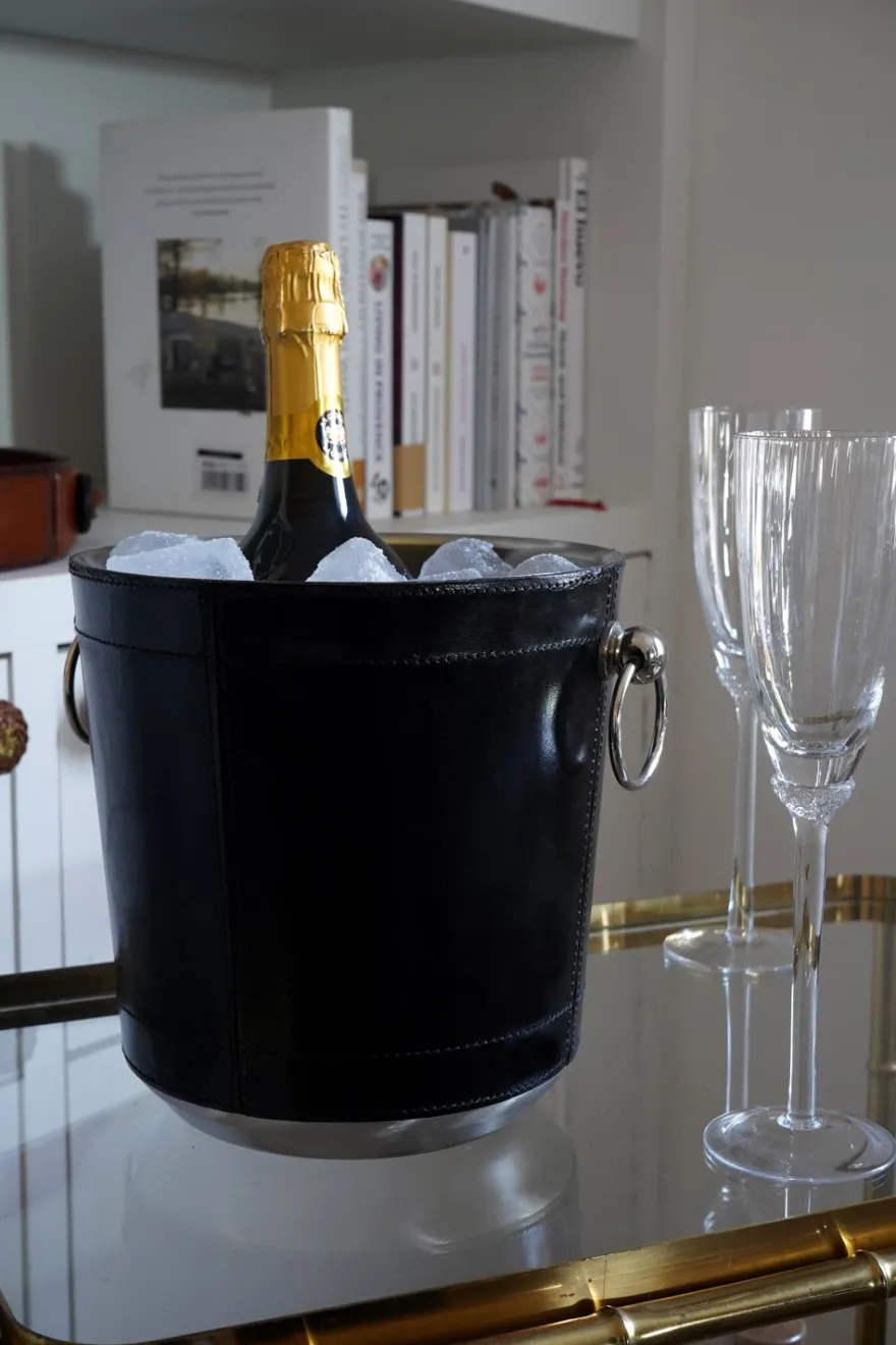 Esta cubitera de cuero es un accesorio elegante y funcional que al estar revestida de cuero negro, le da un aspecto sofisticado y lujoso, ideal para complementar la decoración de una mesa o barra.