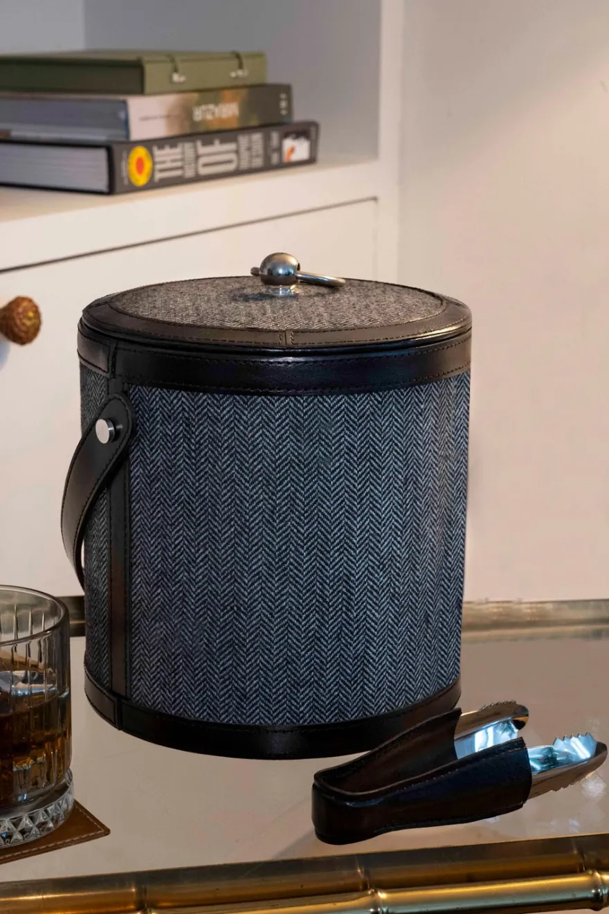 Cubitera de cuero y tela gris oscura con tapa, pinza y asa, perfecta para interiores y exteriores e incluso para el campo.