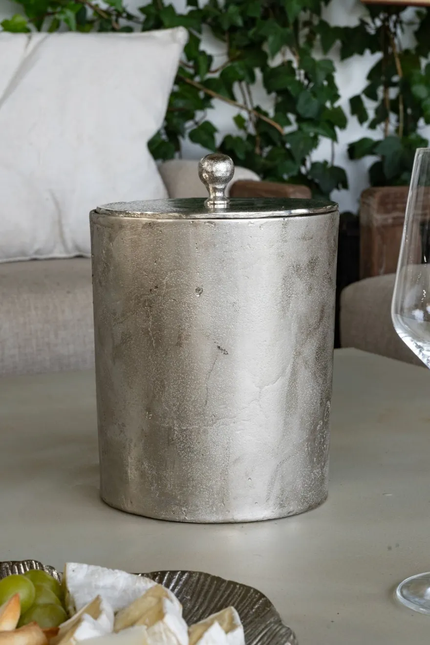 Cubitera mediana de aluminio con tapa, ideal tanto para interiores como exteriores. Su acabado brillante y elegante, combinado con su diseño atemporal, la convierte en un accesorio imprescindible.