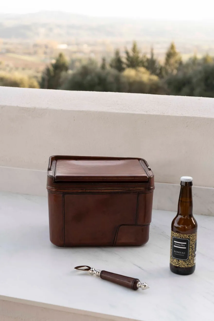 Nevera portátil forrada de cuero pequeña perfecta para interiores y exteriores e incluso para el campo. Mantiene las bebidas y alimentos a buena temperatura en cualquier plan.