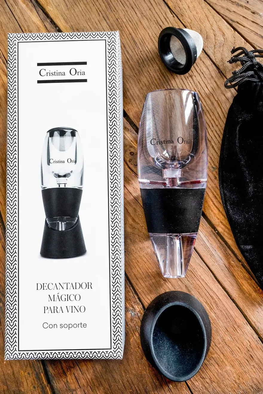 Potencia los aromas y sabores del vino, ya que permite oxigenar a la misma vez que se sirve en la copa. Así se decanta solo el vino servido y no hace falta decantar toda la botella.