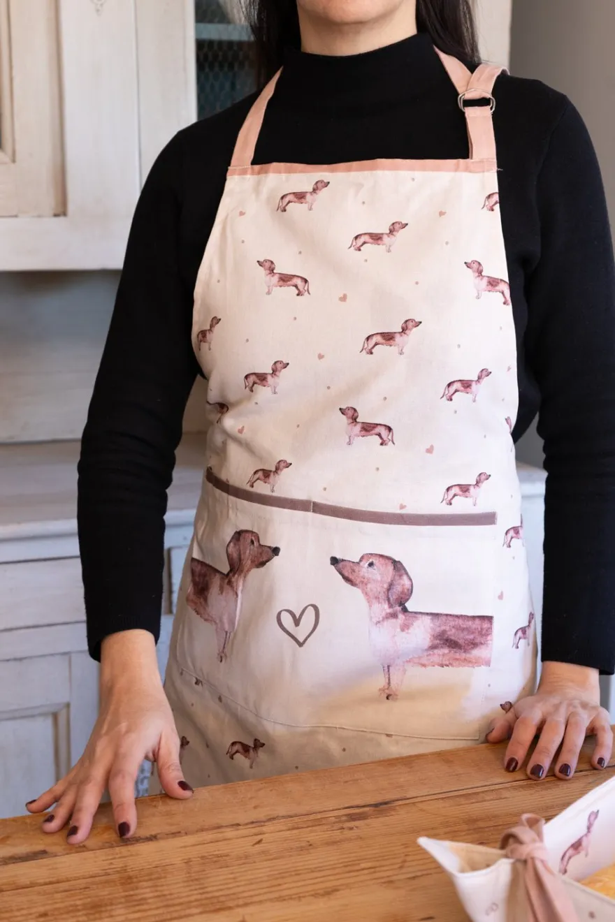 Delantal de algodón con diseño de teckels y corazón. Tiene un bolsillo en la parte frontal.
