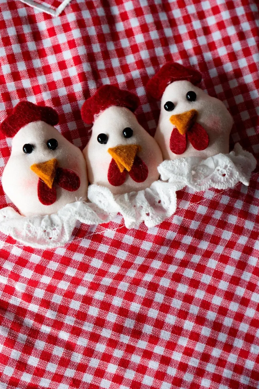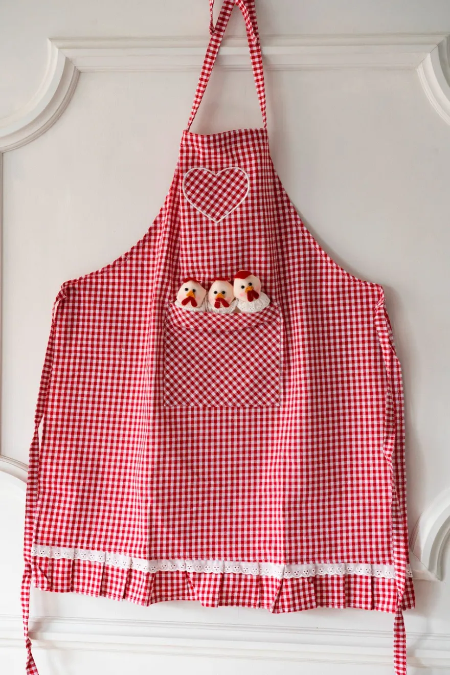 Delantal con diseño de cuadros rojos y blancos, y con gallinas en el bolsillo frontal y corazón.