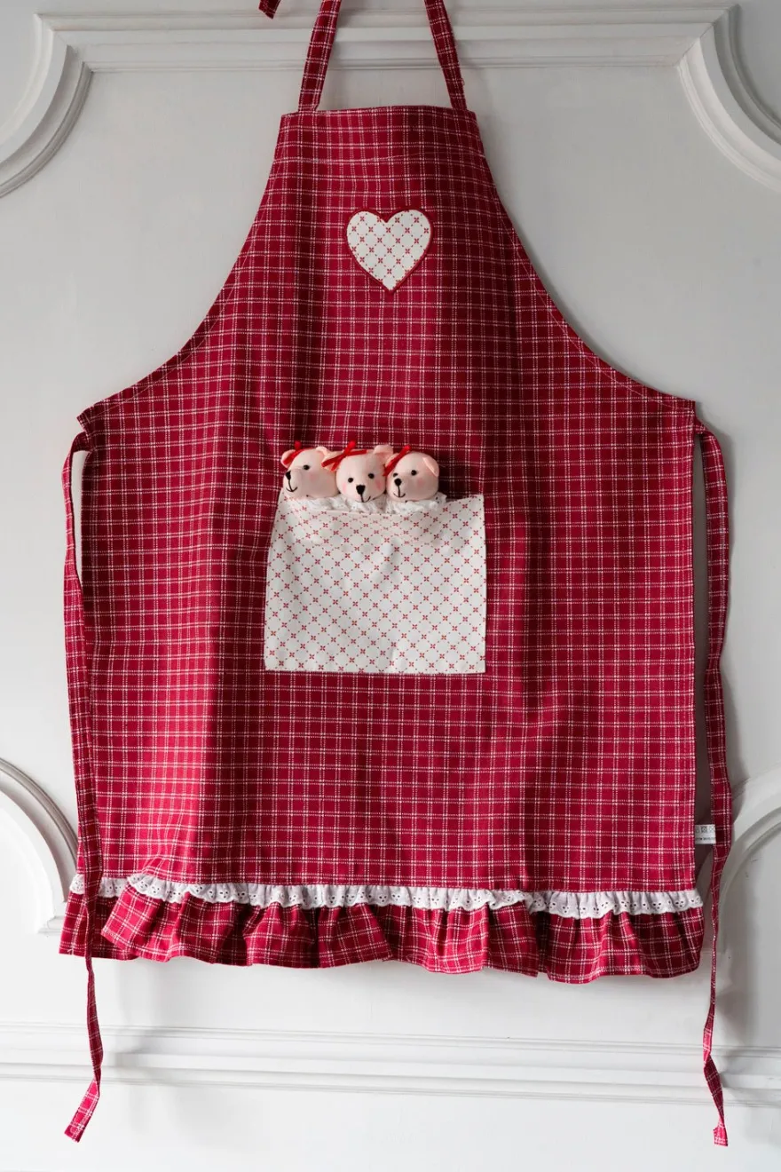 Delantal con diseño de cuadros rojos, y con ositos en el bolsillo frontal y corazón.