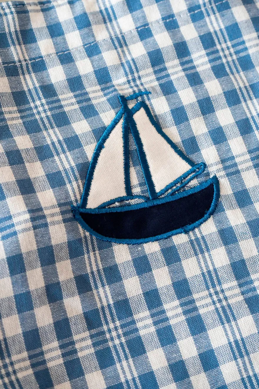 Disponibles en dos tamaños diferentes, con diseño de cuadros azules y blancos, y con ositos en el bolsillo frontal y velero.