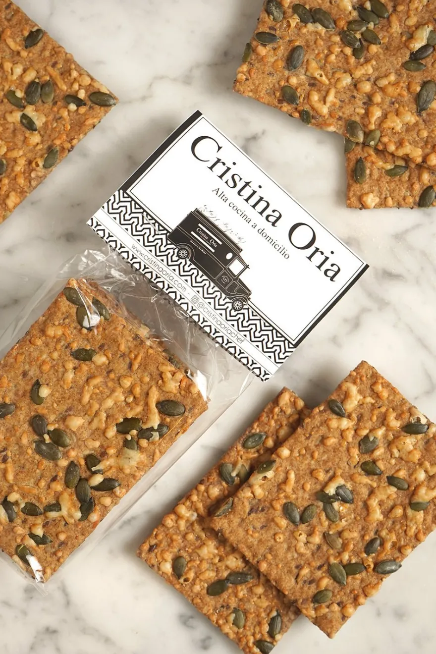 Ingredientes: harina integral de trigo, queso emmental, semillas de calabaza, semillas de lino, aceite de oliva virgen extra, semillas de sésamo, sal marina, levadura, extracto de harina de cebada malteada y harina de centeno