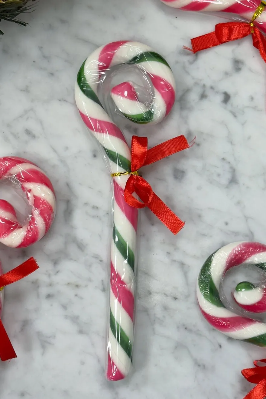Los clásicos bastones de caramelo que con sus tradicionales franjas rojas, blancas y verdes, y adornados con un lazo, son el detalle perfecto para decorar el árbol, regalar o disfrutar en estas fechas tan especiales.
