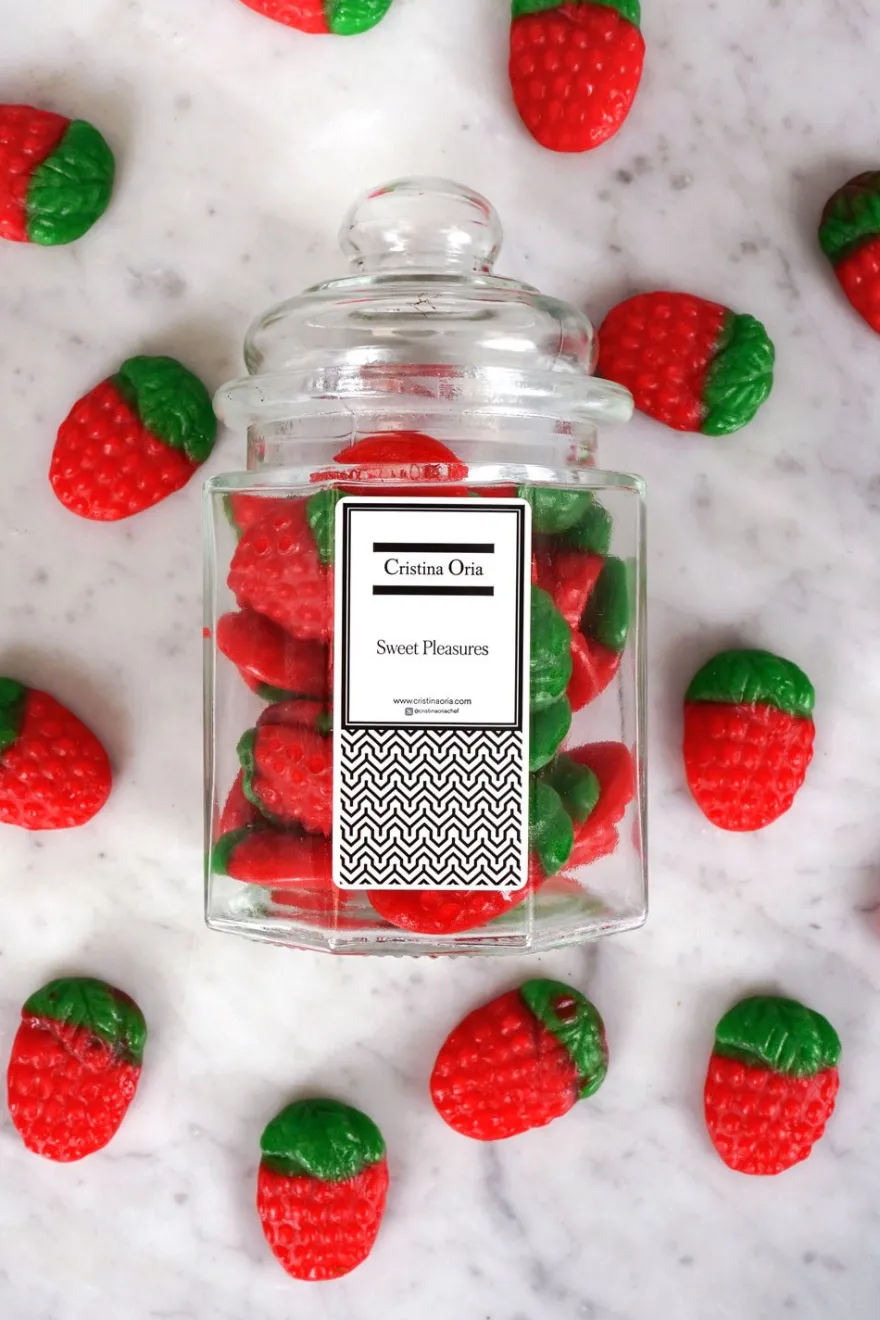 Golosinas de fresas sin gluten en tarrito de cristal.