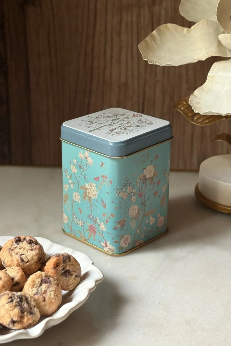 Esta cajita metálica con un detallado diseño de flores rellena de nuestras deliciosas cookies de chocolate es el detalle perfecto para regalar en cualquier ocasión.