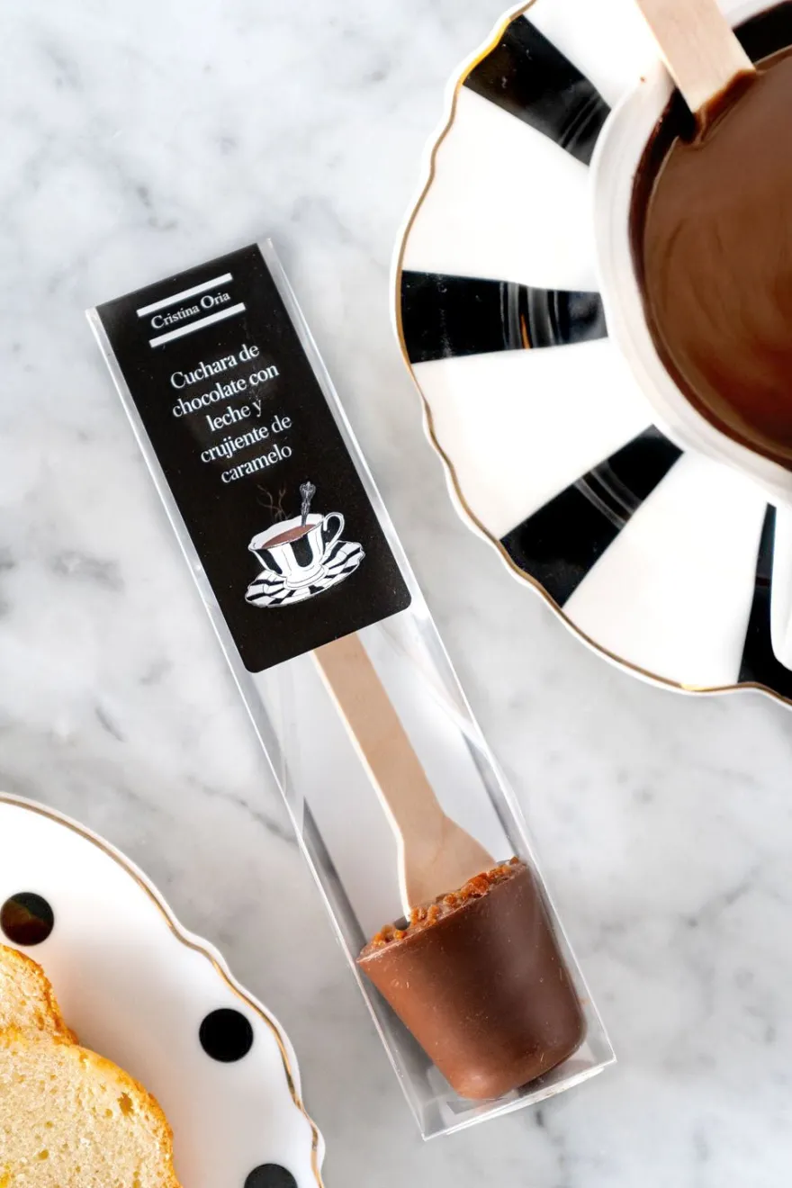 Esta cuchara de chocolate con crujiente de caramelo es un dulce y divertido detalle para estas fiestas. Hecha con chocolate de alta calidad, cubierta de trozos de caramelo crujiente que, al sumergirla en un vaso de leche caliente o en café, se derriten lentamente, liberando un sabor intenso y dulce que se mezcla con la suavidad del chocolate. El toque crujiente del caramelo añade una textura única y un contraste perfecto, creando una experiencia de chocolate caliente rica y reconfortante.
