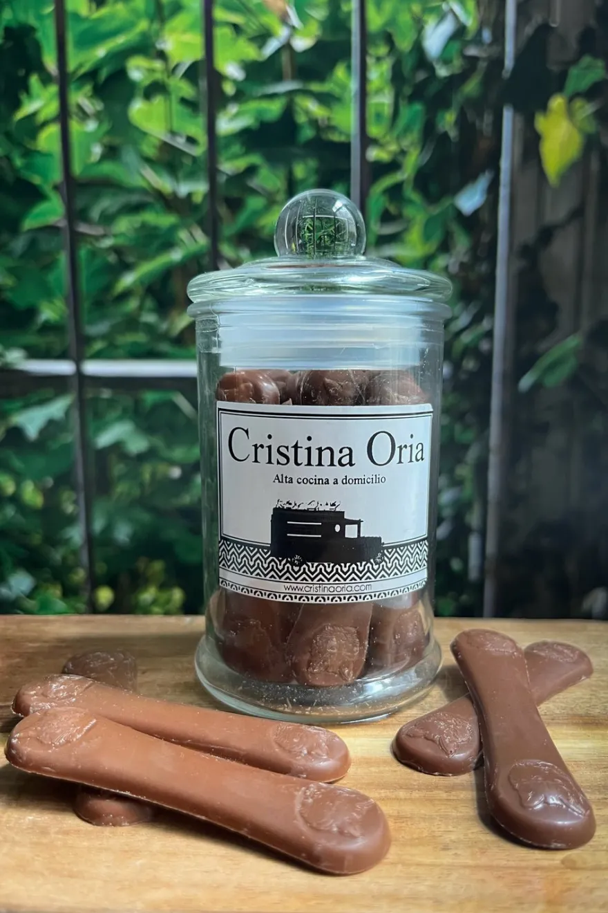 Deliciosas lenguas de gato de chocolate con leche en tarro de cristal.